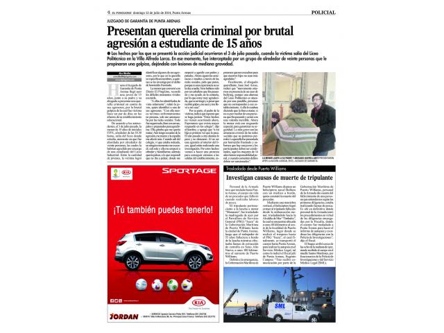Luego de ser violentamente atacada por una pandilla de unas 20 personas a la salida del liceo politécnico, una joven estuvo a punto de perder la vida de no mediar la valiente y osada intervención de un conductor que le salvó la vida. Nuestro estudio rápidamente realizó las coordinaciones para obtener de parte del ministerio público medidas de protección tales como botón de pánico, vigilancia policial, asistencia psicológica y otras medidas de seguridad para la menor afectada. La respectiva querella fue presentada el sábado 12 de Julio por el delito de Homicidio Frustrado y se espera que en la semana se pueden realizar las primeras diligencias que dicen relación con la pandilla que dirige una joven menor de edad que ya se encuentra identificada.